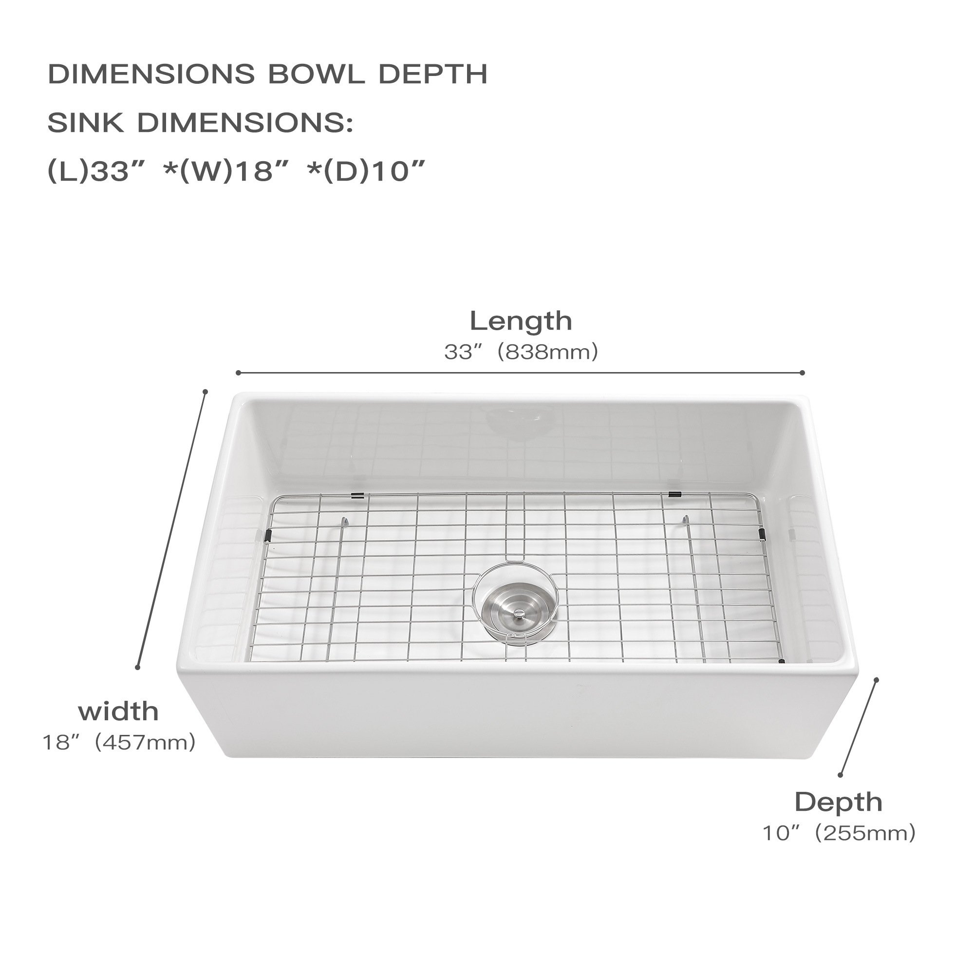 1.33 inch farmhouse kitchen sink is constructed of HIGH-GRADE FIRECLAY that is fired at temperatures of 2900°F for high strength and durability. Quiet farm sink of solid construction.